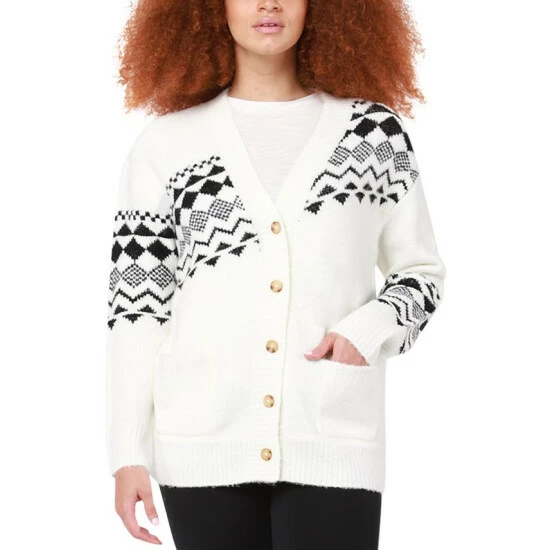 - Geometric intarsia-knit detail at yoke and sleeves; patch pockets at front