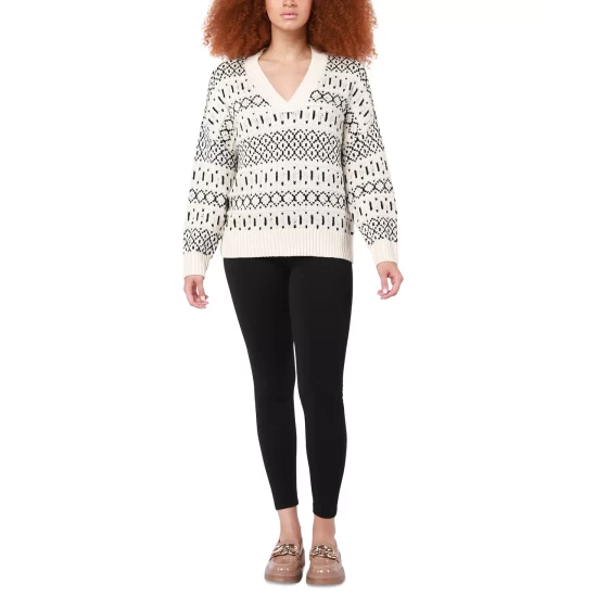 A chic geometric pattern is woven into the knit of Black Tape’s petite V-neck sweater, giving this piece major vintage vibes.
