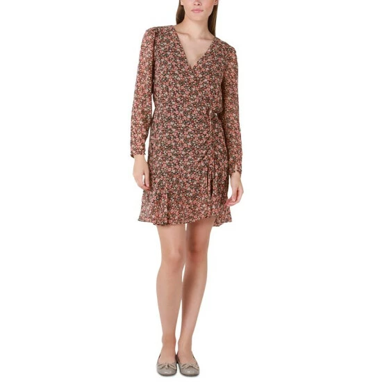 - Wrap-front design with self-tie detail; ruffle hem
