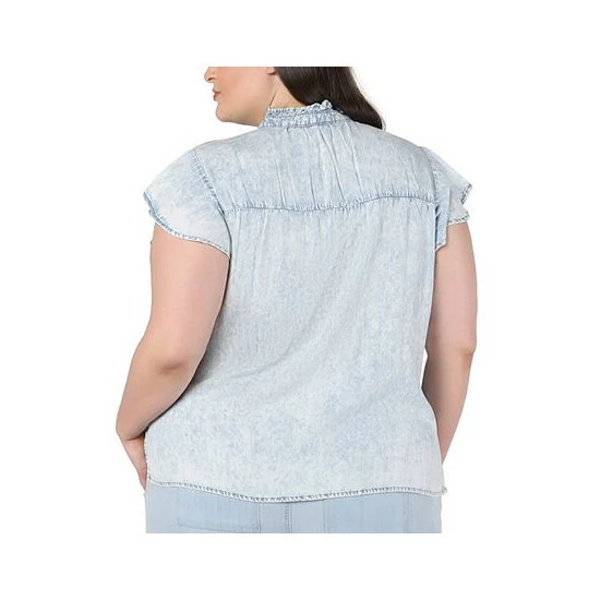 Black Tape takes a new tack on a staple: this plus size chambray shirt features flutter sleeves and a sleek band collar.