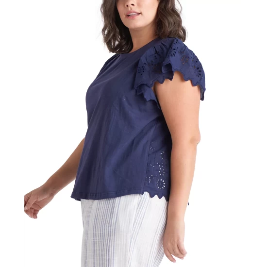 Keep it cute this spring/summer in this flutter-sleeve plus size top from Black Tape, highlighted by eyelet embroidery.