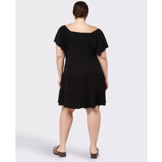 A ruched neckline flows into shoulder-skimming flutter sleeves in this effortless A-line plus size dress from Black Tape.