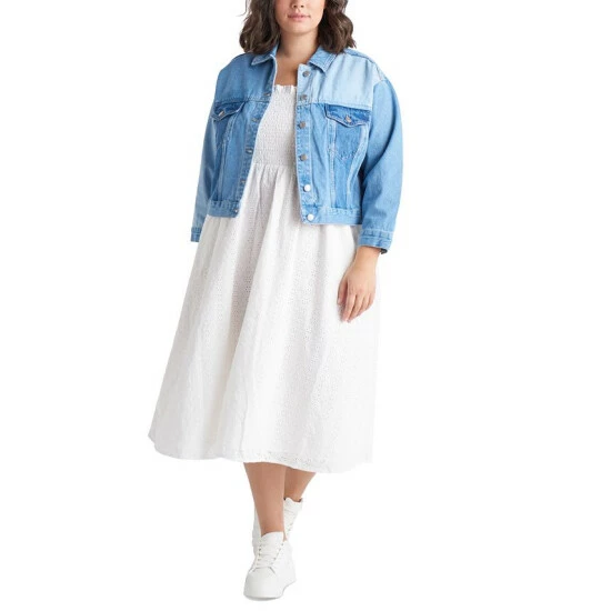 Patchwork, please. Black Tape envisions the classic plus size denim trucker jacket with patches and tonal panels.