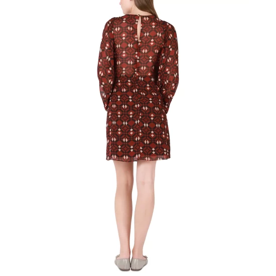 A geometric chiffon print delivers a modern look to Black Tape’s stylish balloon-sleeve sheath, a smart pick for a shower or celebration.